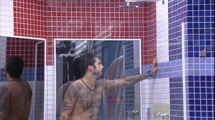 Pedro Scooby toma banho no Quarto do Líder quando é surpreendido pela falta d´água.