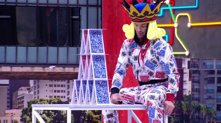 Castigo do Monstro não é mole! Como castigado escolhido pelo Anjo João Gabriel, Diego Hypolito deve construir um castelo de cartas toda vez que a música tocar. Após mais de quatro horas na tentativa, enquanto se afasta de sua construção, o ginasta se desequilibra da mesa e cai, na madrugada deste sábado (5).