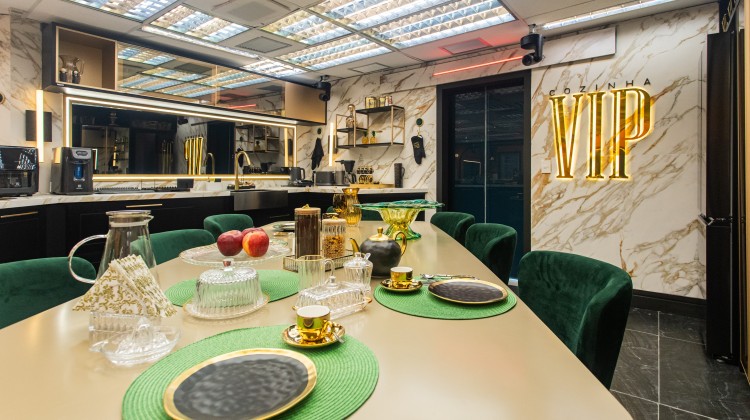 Na cozinha VIP, onde o luxo e a organização são essenciais, os pratos e xícaras Dubai, os copos e taças Leopard e o faqueiro com cabo de resina WOLFF se destacam. Pratos de sobremesa, junto com a manteigueira e queijeira da linha Radial com fio de ouro LYOR criam mesas postas que são sinônimo de sofisticação. Esses itens não apenas embelezam o ambiente, mas também transmitem o conceito de exclusividade e requinte que define a WOLYCASA.